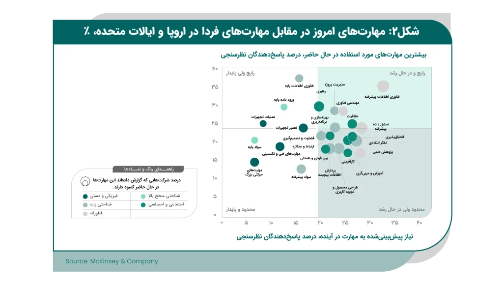 بحرانها اغلب کاتالیزور تغییرات فناورانه و اقتصادی آینده هستند. نظرسنجی شرکت Mckinsey از مدیران ارشد در سال 2024 نشان داد که حدود 40% از شرکتها با کمبود شدید مهارت در حوزه مهارتهای پیشرفته IT و برنامهنویسی، تحلیل دادههای پیشرفته و مهارتهای ریاضیاتی مواجهاند. همچنین مدیران اروپایی و آمریکایی تاکید کردند که علاوهبر مهارتهای پیشرفته در حوزه فناوری اطلاعات و تحلیل داده، به تفکر انتقادی، خلاقیت و ساختاردهی مسائل و پردازش اطلاعات پیچیده نیز نیاز دارند. مهارتهایی که برای همکاری مؤثر با فناوریهای جدید ضروری هستند. (شکل 2) [۱۲]