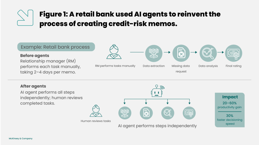 In collaboration with the credit risk team and relationship managers, the bank developed a proof of concept (PoC) to redesign the credit memo preparation workflow using AI agents. In this model, agents extract data, draft different sections of the memo, assign confidence scores to prioritize reviews, and suggest relevant follow-up questions. As a result, the role of the analyst shifts from manual drafting to strategic oversight and exception handling.