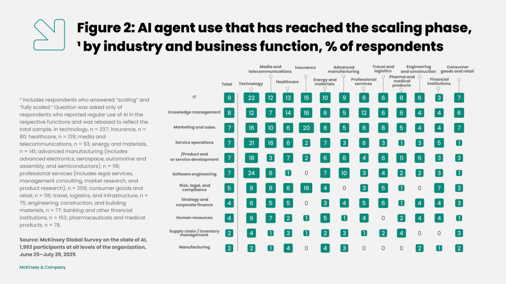 According to data from McKinsey & Company (Global AI Survey 2025, based on responses from 1,993 participants), the adoption of AI agents at scale is most advanced in the high-tech industry (Figure 2). Within this sector, functions such as software engineering and information technology (IT) report the highest levels of scalable agent deployment.[7]