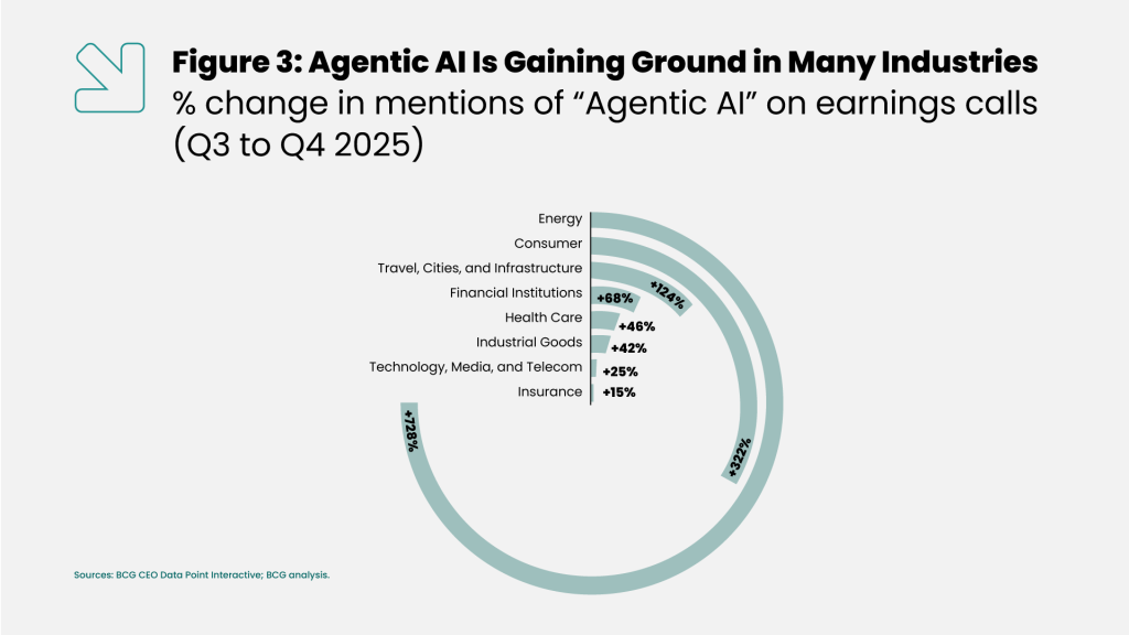 At the same time, Boston Consulting Group reports that from Q3 to Q4 2025, as illustrated in Figure 3, Agentic AI has been gaining traction across a wide range of industries. This indicates that the concept is no longer confined to inherently tech-driven or AI-native companies, but is expanding more broadly across sectors.