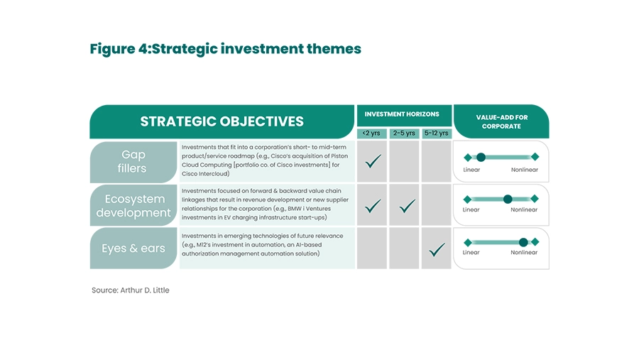 The table Figure 4 highlights three core objectives typically pursued by strategic CVCs.