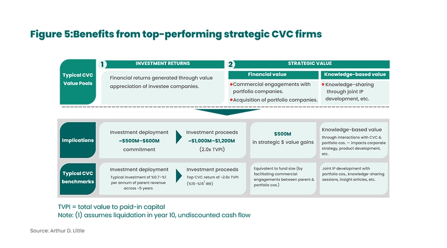 Successful strategic CVCs can achieve internal rates of return (IRR) exceeding 15%, which translates to roughly a 2x multiple on invested capital at the median performance level. Moreover, when properly structured, such investments can generate strategic value equivalent to the entire fund’s financial return — for example, through knowledge-sharing collaborations and the co-development of joint intellectual property (Joint IP) that create long-term value for the parent company.